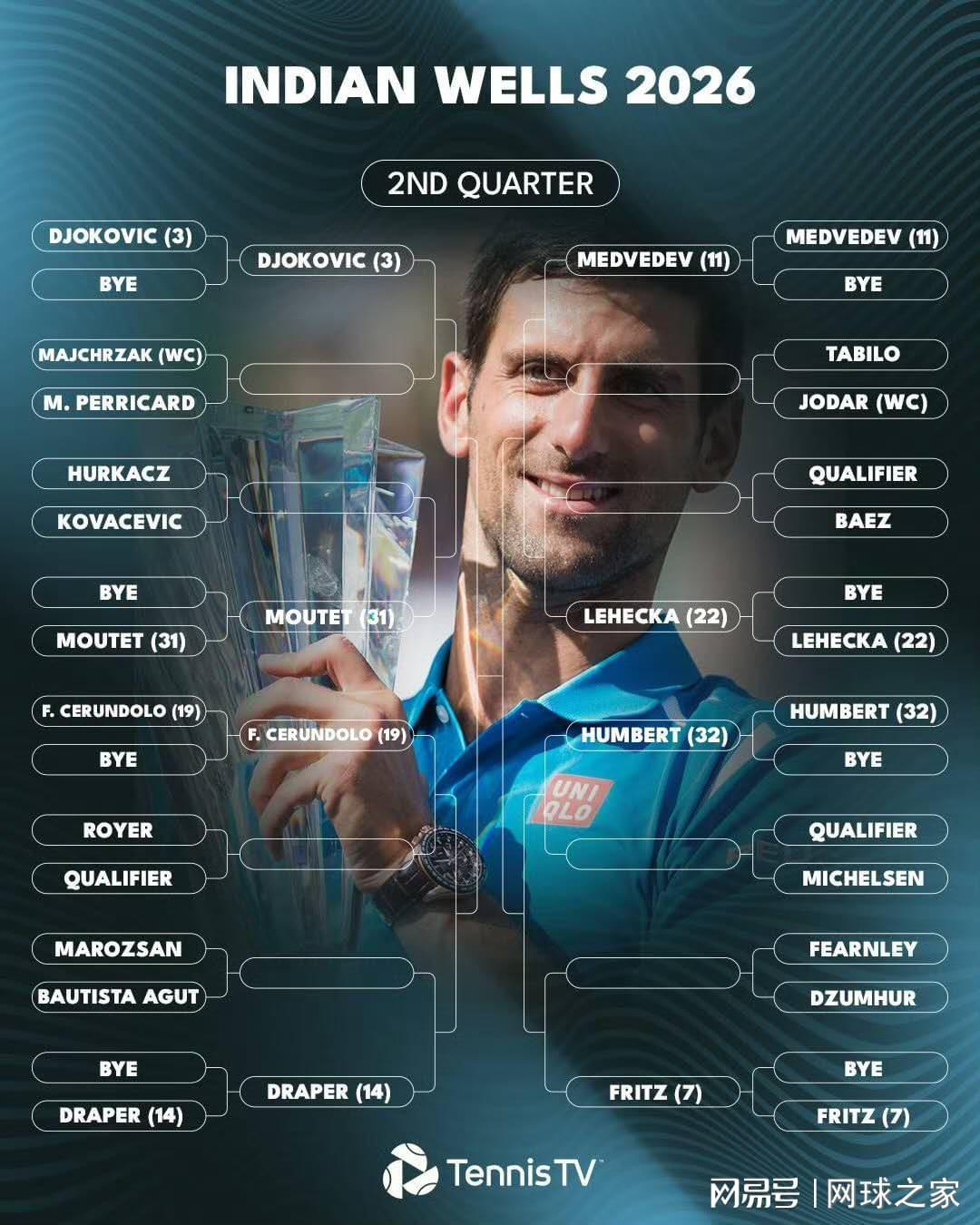 尽管中东地区的战事导致依旧有一部分球员滞留在该地,但不妨碍本周即将揭幕的印第安韦尔斯这站全年首项大师赛的正常进行。日前,赛事方也公布了赛事签表,让我们看看男单的情况。